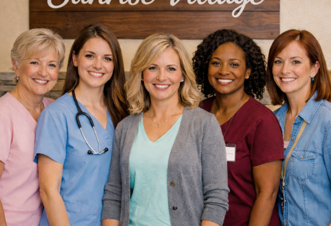 At Sunrise Village, our dedicated health team works collaboratively to ensure every resident receives comprehensive, personalized care. Led by an experienced Registered Nurse who oversees medication management and health monitoring, our team includes compassionate caregivers who provide daily assistance with warmth and respect. We also coordinate closely with visiting therapists, physicians, and specialists to create an integrated approach to wellness. Each member of our health team shares a common purpose: to support residents’ physical well-being while nurturing their emotional and spiritual health. Through open communication with families and a genuine passion for senior care, our team builds trusting relationships that provide peace of mind. At Sunrise Village, residents and their loved ones can rest assured that a circle of dedicated professionals is always close at hand.